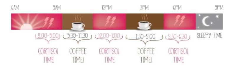 Επειδή τα σώματά μας ελέγχονται από ένα 24ωρο κιρκαδικό ρολόι, υπάρχουν συγκεκριμένες ώρες μέσα στην ημέρα κατά την οποία εκκρίνουμε κορτιζόλη, που μας κρατάει σε φυσική εγρήγορση και είναι οι ώρες που δεν χρειαζόμαστε καφεΐνη.
