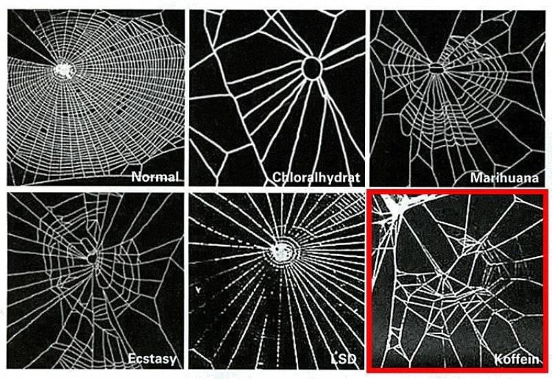 Η NASA πραγματοποίησε (κανείς δεν ξέρει γιατί) κάποια τεστ με διάφορες εθιστικές και μη, ουσίες σε αράχνες και τις άφησε να φτιάξουν τους ιστούς τους, για να δουν τα αποτελέσματα. Όπως μπορείτε να παρατηρήσετε και στις εικόνες, οι αράχνες δεν μεταβολίζουν την καφεΐνη με τον ίδιο τρόπο που το κάνουν οι άνθρωποι και γι αυτό έχει πολύ μεγάλη επιρροή πάνω τους.