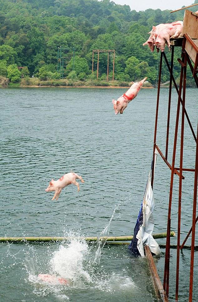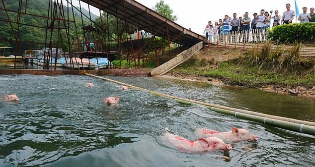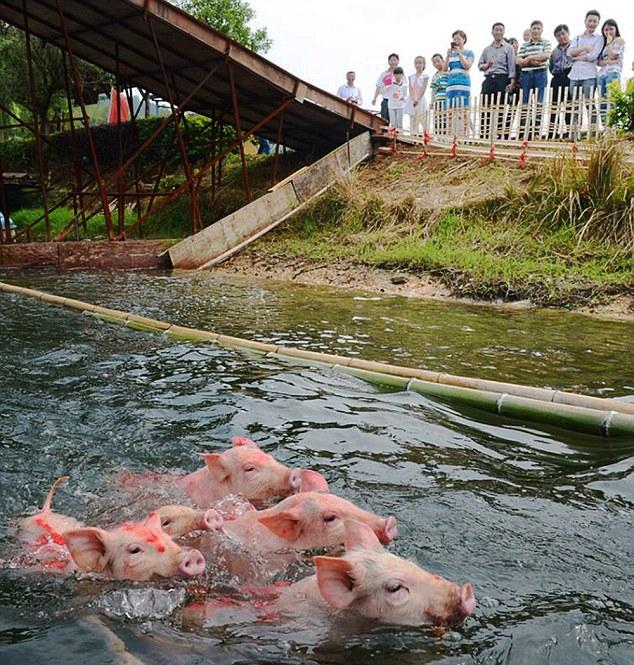 Ένα ξεχωριστό θέαμα προσφέρει ο διαγωνισμός κολύμβησης γουρουνιών, ο οποίος λαμβάνει χώρα στην λίμνη Shiyan της Κίνας την Πρωτομαγιά. Το δρώμενο συγκεντρώνει μεγάλο αριθμό επισκεπτών, οι οποίοι παρακολουθούν τα γουρούνια να πηδάνε απ’ την εξέδρα της λίμνης με ζωγραφισμένους αριθμούς στις ράχες τους.