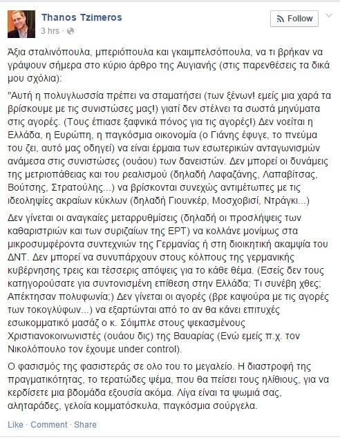 Συγχύστηκε όπως φαίνεται ο Θάνος Τζήμερος από το κύριο άρθρο της «Αυγής», για την οποία διατυπώνει ειρωνικά σχόλια, ενώ για τους συντάκτες της εξαπολύει υβρεις όπως γκαιμπελσόπουλα, σταλινόπουλα και μπεριόπουλα.