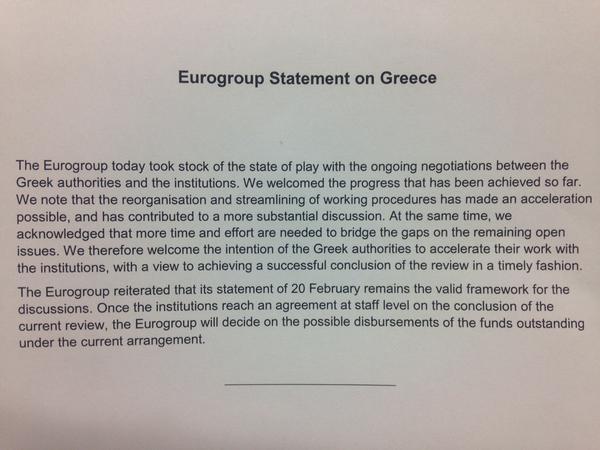 Το Eurogroup επαναβεβαίωσε ότι η δήλωση της 20ης Φεβρουαρίου παραμένει το πλαίσιο των συζητήσεων. Το Eurogroup θα λάβει αποφάσεις για πιθανή εκταμίευση των χρημάτων που απομένουν στο πλαίσιο της τρέχουσας συμφωνίας, μόλις επιτευχθεί με τους θεσμούς συμφωνία σε τεχνικό επίπεδο (staff level) για την ολοκλήρωση της τρέχουσας αξιολόγησης».