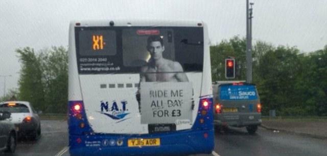 Οργή προκάλεσε στους επιβάτες μια εταιρεία αστικών λεωφορείων στην Ουαλία, χρησιμοποιώντας διαφημιστική εκστρατεία με τόπλες μοντέλα που κρατάνε πινακίδες με το σλόγκαν «Καβάλα με όλη μέρα για 3 λίρες» (περίπου 4 ευρώ).