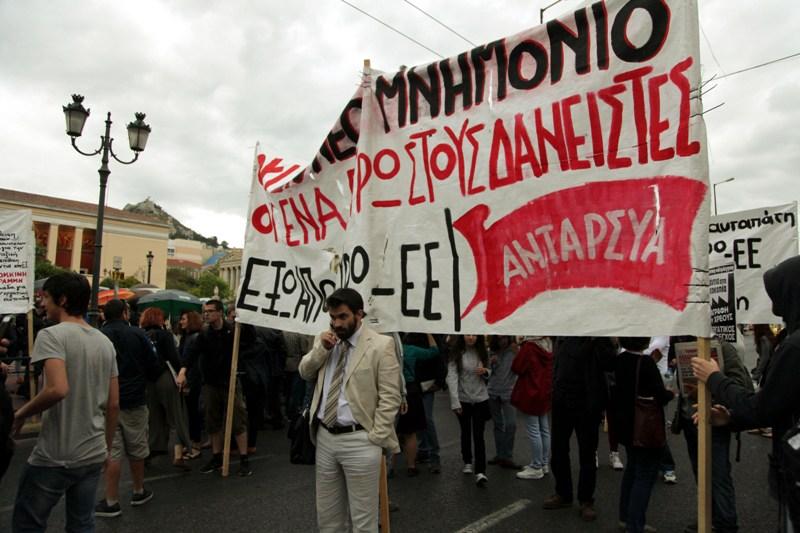 Οι συγκεντρωμένοι απαίτησαν τη διαγραφή του χρέους και την ανατροπή της πολιτικής της Ευρωπαϊκής Ένωσης, με αφορμή τη συνεδρίαση του Συμβουλίου Υπουργών Οικονομικών της Ευρωζώνης.