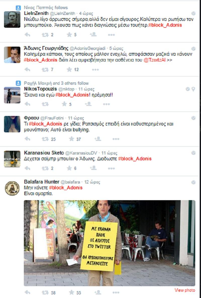 Το #block_Adonis είναι το περιβόητο hashtag που προέκυψε μετά από την αντιπαράθεση που είχε ο πρώην υπουργός Υγείας με έναν follower του. Η διαμάχη ξεκίνησε από τη μεταφορά των λειψάνων της Αγίας Βαρβάρας στο νοσοκομείο «Άγιος Σάββας», πέρασε στο θέμα των καρκινοπαθών και στην πολιτική που ακολούθησε στο υπουργείο Υγείας ο Αδωνις Γεωργιάδης.