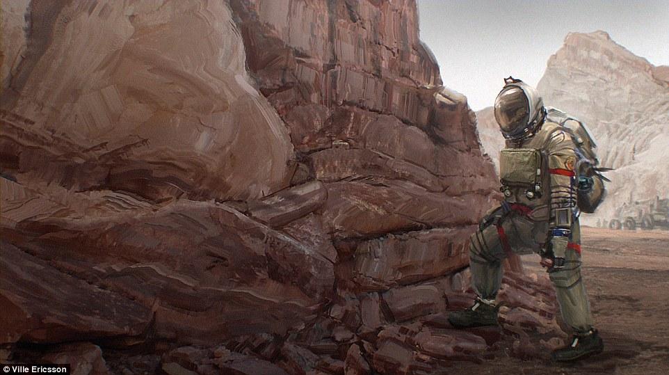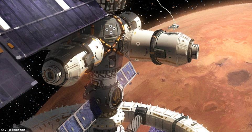 Ο Έρικσον «βλέπει» διαστημικό σταθμό σε τροχιά γύρω από τον κόκκινο πλανήτη, που διαθέτει συλλέκτες ηλιακής ενέργειας για την παροχή ηλεκτρικού ρεύματος, εκτός από μεγάλες δεξαμενές καυσίμου, ενώ ένα περιστρεφόμενο τμήμα παρέχει τεχνητή βαρύτητα για το πλήρωμα .