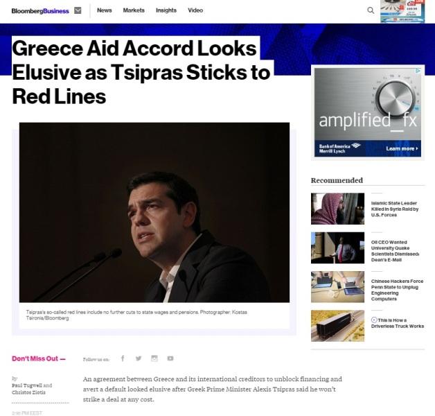 Μια συμφωνία ανάμεσα στην Ελλάδα και στους διεθνείς πιστωτές της μοιάζει απίθανη μετά τις δηλώσεις του Αλέξη Τσίπρα στο συνέδριο του Economist, σημειώνει σε δημοσίευμα του το ειδησεογραφικό πρακτορείο Bloomberg.