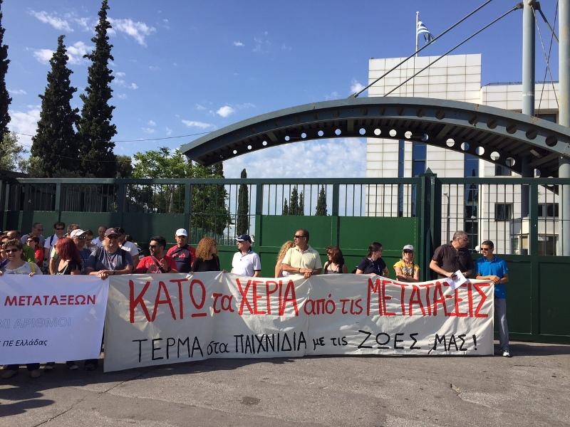 Για την ανάκληση 4.000 μετατάξεων από τη Δευτεροβάθμια, στην Πρωτοβάθμια εκπαίδευση διαμαρτύρονται οι εκπαιδευτικοί που έχουν συγκεντρωθεί έξω από το υπουργείο Παιδείας, με βασικό σύνθημα «Κάτω τα χέρια από τις μετατάξεις».