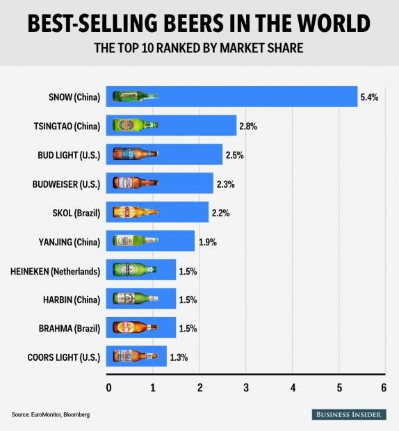 Η μπίρα Snow της Κίνας κατέχει περισσότερο από το 5% της παγκόσμιας αγοράς, δηλαδή 1 στις 20 μπύρες που πωλούνται σε όλο τον κόσμο είναι Snow, παρόλο που η μάρκα αυτή είναι σχεδόν άγνωστη στη Δύση.