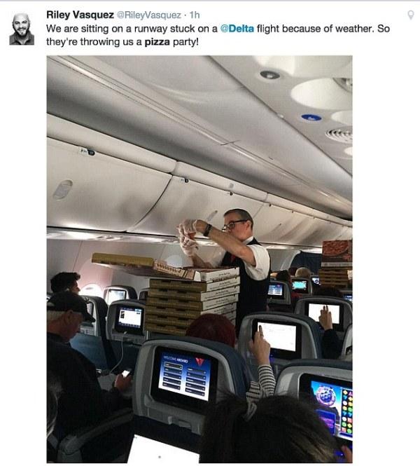 Δεν πίστευαν στα μάτια τους οι επιβάτες της πτήσης Delta, όταν λόγω πολύωρης καθυστέρησης ο πιλότος του καθηλωμένου σε αεροδρόμιο αεροσκάφους τους ετοίμασε πάρτι με πίτσες για να μετριάσει τις αντιδράσεις τους.