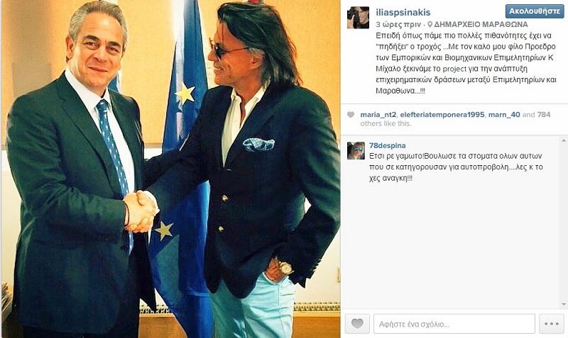 Ο Δήμαρχος Μαραθώνα δέχθηκε στο Δημαρχείο τον Πρόεδρο των Εμπορικών και Βιομηχανικών Επιμελητηρίων Κωνσταντίνο Μίχαλο και μετά την συνάντηση έβαλε στον λογαριασμό του στο Instagram φωτογραφία μαζί του συνοδεύοντάς την με ένα σχόλιο γεμάτο… νόημα.