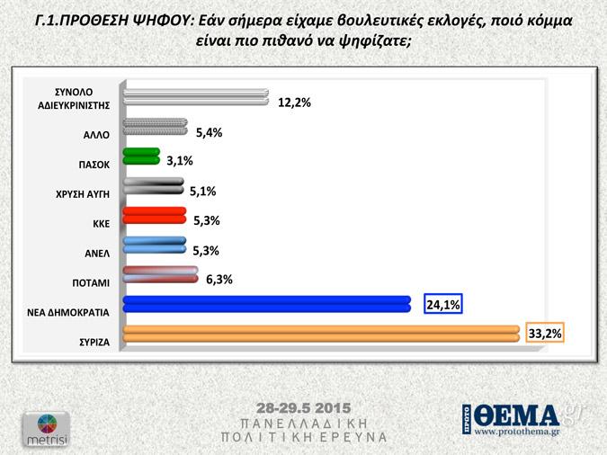 Μπροστά με 9,1 ποσοστιαίες μονάδες στην πρόθεση ψήφου εμφανίζει τον ΣΥΡΙΖΑ, δημοσκόπηση της εταιρίας «ΜETRISI» που διενεργήθηκε για λογαριασμό του «Πρώτου Θέματος».