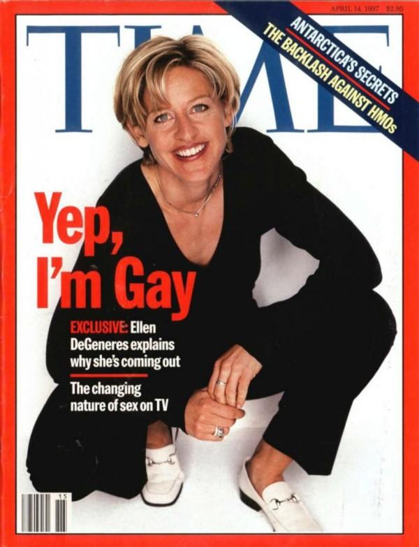 Σε ένα από τα πιο πολυσυζητημένα εξώφυλλα, η ηθοποιός και παρουσιάστρια παραδέχτηκε δημόσια το 1997 την ομοφυλοφιλία της στο περιοδικό TIME. «Ναι, είμαι γκέι» ήταν ο τίτλος του εξωφύλλου, με τη θαρραλέα επιλογή της Degeneres να κάνει τον γύρο του κόσμου.