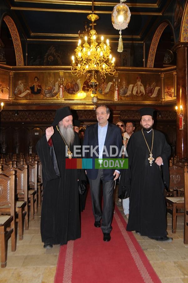 Με τις καμπάνες να χτυπούν χαρμόσυνα, υποδέχτηκαν τον πρόεδρο της ΝΔ Αντώνη Σαμαρά στην Ιερά Μονή Φανερωμένης στη Λευκάδα.