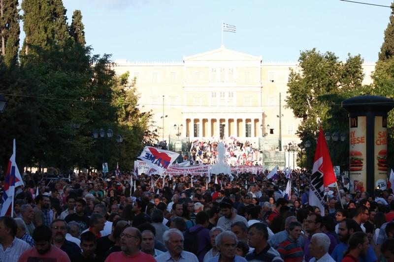 Μεγάλη η συγκέντρωση του ΠΑΜΕ έξω από το κατειλημμένο υπουργείο Οικονομικών, ενάντια στην συμφωνία που προτίθεται να υπογράψει η κυβέρνηση.