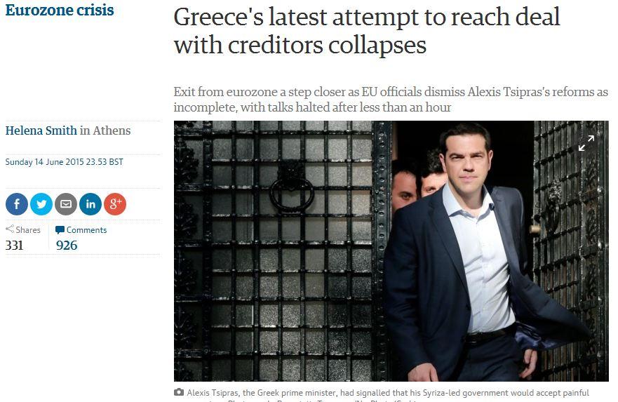 Οι μεγαλύτερες εφημερίδες και πρακτορεία ασχολήθηκαν εκτενώς με την εσπευσμένη διακοπή των διαπραγματεύσεων την Κυριακή και περιγράφουν με «μελανά χρώματα» το μέλλον της χώρας.