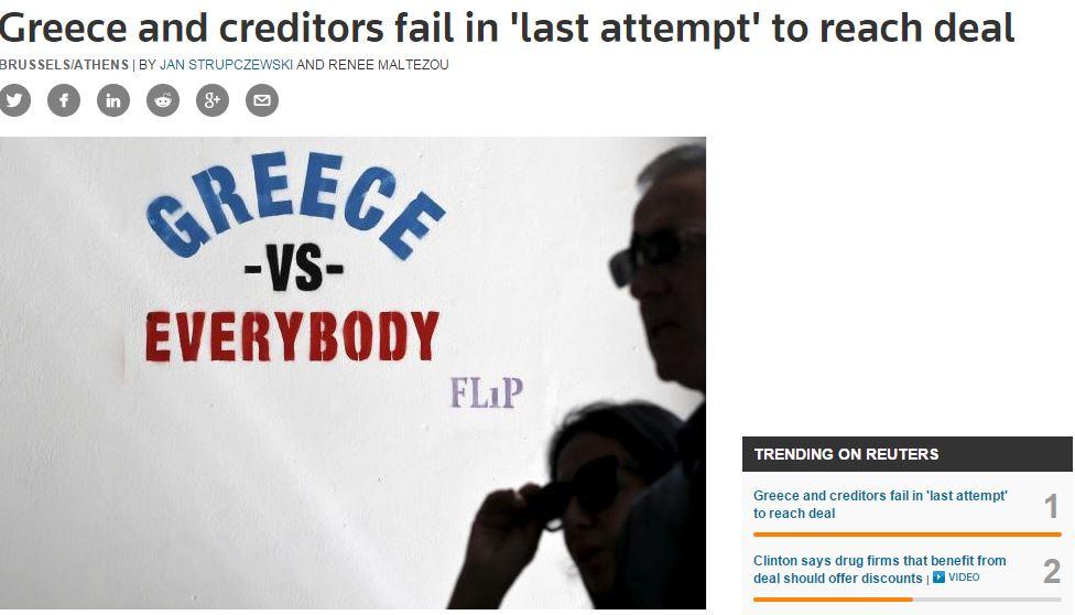 Οι συζητήσεις για αποφυγή του αδιεξόδου μεταξύ της Ελλάδας και των διεθνών δανειστών απέτυχαν, με τους Ευρωπαίους ηγέτες να εκφράζουν την απογοήτευσή τους καθώς η Αθήνα βρίσκεται πλέον ένα βήμα πιο κοντά στην χρεοκοπία που απειλεί το μέλλον του ευρώ.