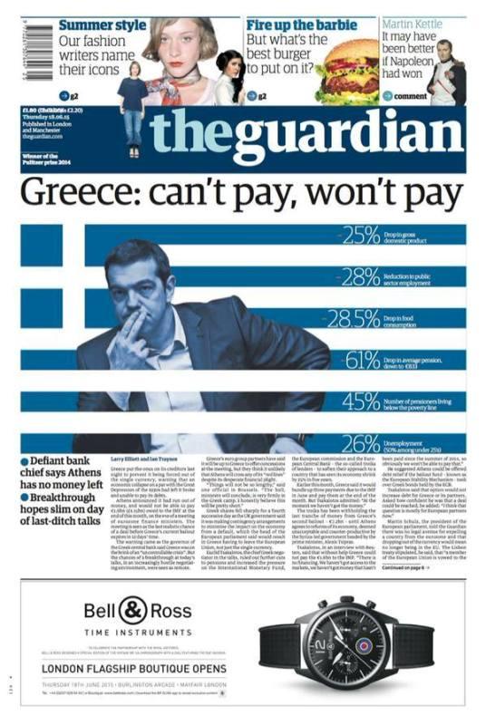 Με τον Αλέξη Τσίπρα σε γαλανόλευκο φόντο και τους τραγικούς αριθμούς της ελληνικής οικονομίας και κοινωνίας της κρίσης εκδόθηκε ο Guardian, προκαλώντας αίσθηση.
