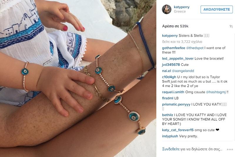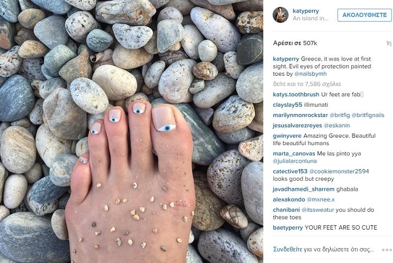 Η Κέιτι Πέρι πέραν από τις φωτογραφίες με τα χαρακτηριστικά άσπρα σπίτια των Κυκλάδων, τις εκκλησίες και το ηλιοβασίλεμα στην Οία, έδειξε και το πεντικιούρ που της έκαναν στην Ελλάδα για να μην την πιάνει το μάτι, ενώ «ανέβασε» στο Instagram και φωτογραφία της με βραχιολάκια για να μην την ματιάζουν.