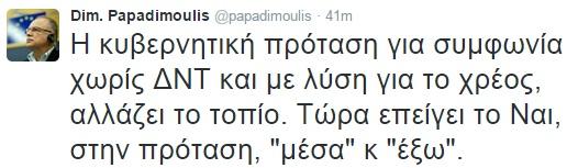 «Η κυβερνητική πρόταση για συμφωνία χωρίς ΔΝΤ και με λύση για το χρέος, αλλάζει το τοπίο. Τώρα επείγει το Ναι, στην πρόταση, “μέσα” κ “έξω”», έγραψε ο κ. Παπαδημούλης.