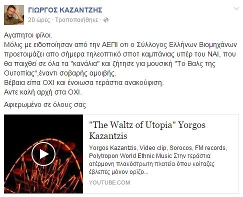 Ωστόσο όπως ο ίδιος σχολιάζει δήλωσε «περήφανα ΟΧΙ και ένιωσε τεράστια ανακούφιση! Άντε και καλή αρχή στα ΟΧΙ» καταλήγει ο Γιώργος Καζαντζής.