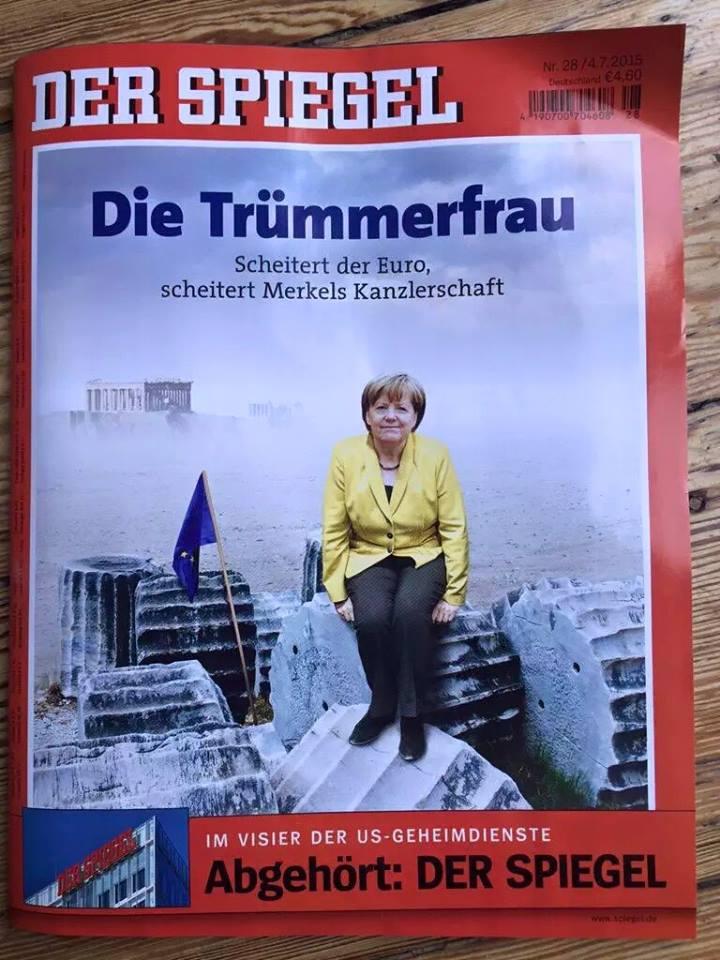 Στην πρώτη σελίδα εμφανίζεται η καγκελάριος της Γερμανίας Άνγκελα Μέρκελ να κάθεται μάλλον αμήχανη πάνω στα συντρίμια ενός αρχαιοελληνικού ναού, ενώ ο Παρθενώνας αχνοφαίνεται 2 φορές στο βάθος της εικόνας, με τον τίτλο να αναφέρει «Η κυρία των ερειπίων».
