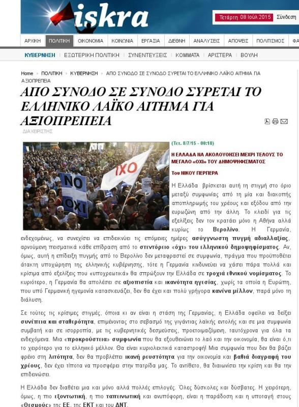 Λίγη ώρα μετά το τελεσίγραφο των Ευρωπαίων εταίρων, αναρτήθηκε άρθρο στην ιστοσελίδα iskra, που εκφράζει τις απόψεις της Αριστερής Πλατφόρμας του ΣΥΡΙΖΑ, με το οποίο ζητά από την κυβέρνηση να επιμείνει μέχρι τέλους στο «Όχι».