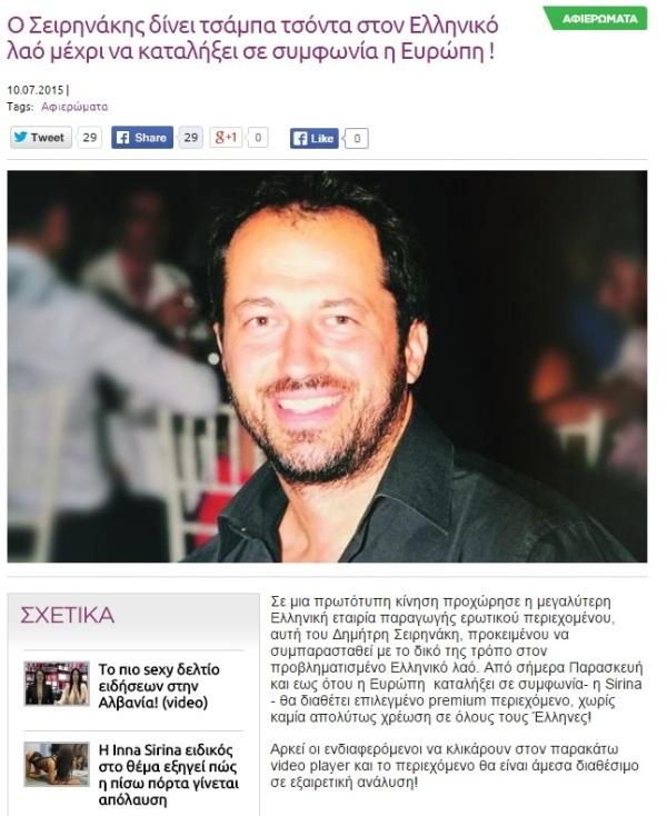 Στην ιστοσελίδα της εταιρίας ταινιών ενηλίκων Sirina, αναφέρεται χαρακτηριστικά: «Σε μια πρωτότυπη κίνηση προχώρησε η μεγαλύτερη Ελληνική εταιρία παραγωγής ερωτικού περιεχομένου, αυτή του Δημήτρη Σειρηνάκη, προκειμένου να συμπαρασταθεί με το δικό της τρόπο στον προβληματισμένο Ελληνικό λαό. Aπό σήμερα Παρασκευή και εως ότου η Ευρώπη  καταλήξει σε συμφωνία- η Sirina – θα διαθέτει επιλεγμένο premium περιεχόμενο, χωρίς καμία απολύτως χρέωση σε όλους τους Έλληνες!»