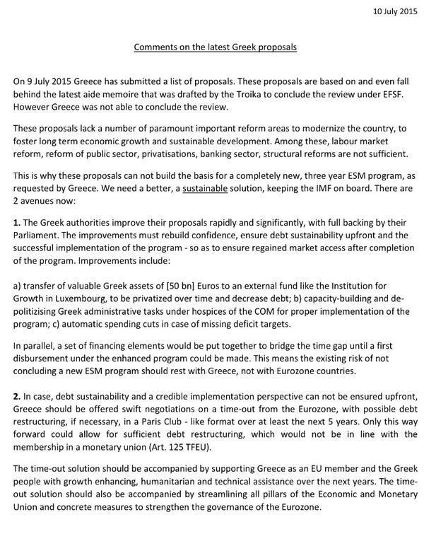 “Στις 9 Ιουλίου η Ελλάδα υπέβαλλε την λίστα των προτάσεών της. Αυτές οι προτάσεις βασίζονται και βρίσκονται λίγο πίσω από το πρόγραμμα που συντάχθηκε από την Τρόικα για να κλείσει την αξιολόγηση υπό τον EFSF. Παρόλα αυτά η Ελλάδα δεν κατάφερε να ολοκληρώσει την αξιολόγηση.