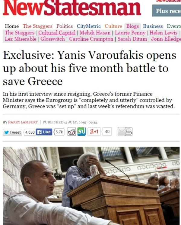 Ο δημοσιογράφος του Newstatesman , στον πρόλογο της συνέντευξης αναφέρει ότι ο Γιάνης Βαρουφάκης του είχε πει:
