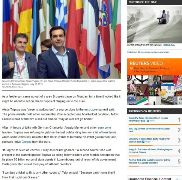 Μετά από 14 ώρες διαπραγματεύσεων και ενώ υπήρχαν έντονες κριτικές απέναντι στον Αλέξη Τσίπρα που υποδείκνυαν ότι το Βερολίνο θέλει να ξεφτιλίσει τον Αριστερό πρωθυπουργό και ενδεχομένως να οδηγήσει την Ελλάδα εκτός ευρώ.