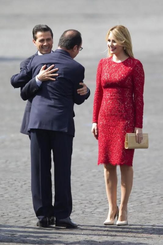 Στο αεροδρόμιο τους περίμενε ως έπρεπε από το πρωτόκολλο ο Πρόεδρος της Γαλλικής Δημοκρατίας, Φρανσουά Ολάντ. Οι πόρτες του αεροπλάνου άνοιξαν, ο πρόεδρος του Μεξικό εμφανίσθηκε στις σκάλες και πίσω του η Ριβέρα. Ψηλή, ξανθιά, φορούσε ένα στενό κατακόκκινο φόρεμα με λευκές ψηλοτάκουνες γόβες.