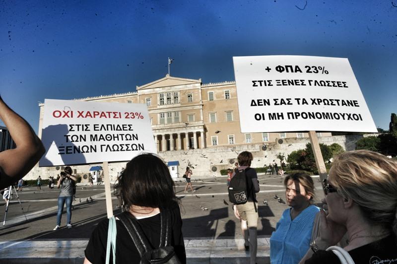 Σην πλατεία Συντάγματος πραγματοποίησαν πορεία τα μέλη του πανελληνίου συλλόγου ιδιοκτητών Κέντρων Ξένων Γλωσσών. Στον χώρο των φροντιστηρίων μέσης εκπαίδευσης και ξένων γλωσσών επικρατεί προβληματισμός για την επιβολή ΦΠΑ 23% στα δίδακτρα.