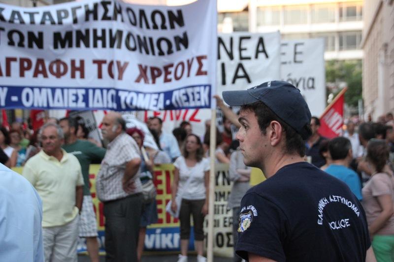 Πορεία προς της πλατεία Συντάγματος πραγματοποιούν μέλη του ΠΑΜΕ που νωρίτερα είχαν πραγματοποιήσει συγκέντρωση στην Ομόνοια διαμαρτυρόμενοι κατά του δεύτερου νομοσχεδίου με τα προαπαιτούμενα.