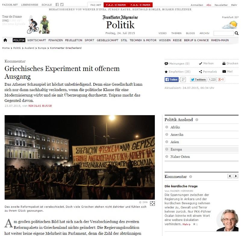Σε άρθρο-σχόλιό της η γερμανική εφημερίδα Frankfurter Allgemeine εκτιμά ότι η ΕΕ στην περίπτωση της Ελλάδας προσπαθεί για πρώτη φορά να αναγκάσει έναν λαό να κάνει κάτι που δεν επιθυμεί, ένα πείραμα με αμφίβολο αποτέλεσμα.