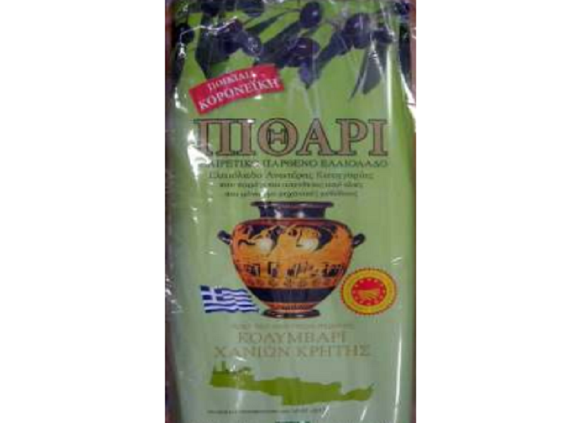 – Το προϊόν το οποίο πωλείται ως «Εξαιρετικό Παρθένο Ελαιόλαδο», µε την εµπορική ονοµασία «ΠΙΘΑΡΙ», συσκευασίας των 5 λίτρων και ηµεροµηνία λήξης 20- 3-2017, το οποίο διακινείται από την εταιρία µε την επωνυµία «ΜΑΡΚΟΥΛΑΚΗΣ ΕΜΜΑΝΟΥΗΛ», µε έδρα την Ιωνία Θεσσαλονίκης, είναι νοθευµένο µε ξένη προς το ελαιόλαδο λιπαρή ύλη. Πρόκειται για µη σύννοµη διακίνηση και ουδεµία σχέση έχει η όποια αναφορά γίνεται στην επισήµανση του εν λόγω προϊόντος και παραπέµπει σε ελληνικό τοπωνύµιο γνωστό για την ποιότητα του παραγοµένου ελαιολάδου.