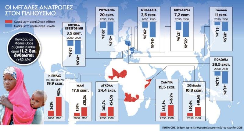Μόνο από τη Βουλγαρία φεύγουν κάθε χρόνο δεκάδες χιλιάδες άνθρωποι, με προορισμό άλλες ευρωπαϊκές χώρες ή ακόμη και την Αμερική. Μέσα στα επόμενα 35 χρόνια, ο πληθυσμός χωρών όπως η Βουλγαρία, η Κροατία, η Ουγγαρία, η Ρουμανία, η Σερβία, η Ουκρανία και η Βοσνία-Ερζεγοβίνη θα μειωθεί κατά τουλάχιστον 15%. Γενικότερα, όμως, ο παγκόσμιος πληθυσμός θα είναι αρκετά… γερασμένος, καθώς οι άνθρωποι άνω των 60 ετών θα διπλασιαστούν μέχρι το 2050 και θα τριπλασιαστούν μέχρι το 2100. Την ίδια στιγμή η Αφρική βιώνει μια πληθυσμιακή έκρηξη και μέχρι το 2100 ο πληθυσμός θα έχει σχεδόν τετραπλασιαστεί.