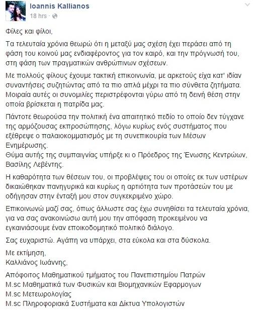 Ο Γιάννης Καλλιάνος γνωστοποίησε μέσω Facebook την απόφασή του.