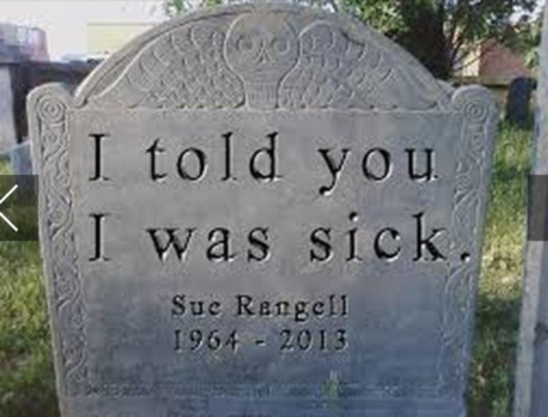 «Σας είπα ότι αισθανόμουν άρρωστη. Δεν με πιστέψατε. Σου Ρέιντζελ» γράφει μια ταφόπλακα με δόση μαύρου χιούμορ.