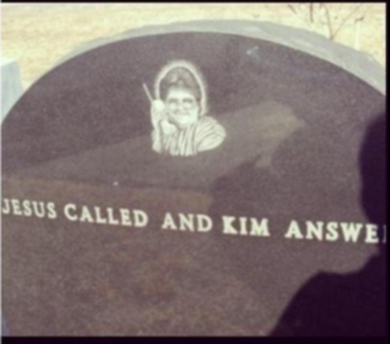 Μια άλλη ταφόπλακα δείχνει το πρόσωπο της αποθανούσας να μιλάει στο κινητό και γράφει: «Ο Χριστός κάλεσε και η Κιμ απάντησε»