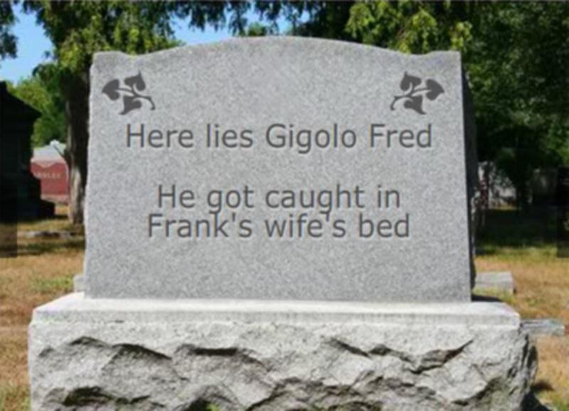 Ενώ κάποιος «ατακτούλης» Φρεντ στην ταφόπλακα του γράφει: «Εδώ αναπαύεται ο Ζιγκολό Φρεντ. Πιάστηκε στο κρεβάτι του Φράνκ με τη γυναίκα του»