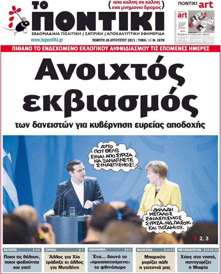 Το «Ποντίκι» κυκλοφορεί την Πέμπτη, 20 Αυγούστου, με πρωτοσέλιδο τίτλο «Ανοιχτός εκβιασμός των δανειστών για κυβέρνηση ευρείας αποδοχής» και αναλυτικό – αποκαλυπτικό ρεπορτάζ για το ενδεχόμενο εκλογικού αιφνιδιασμού.