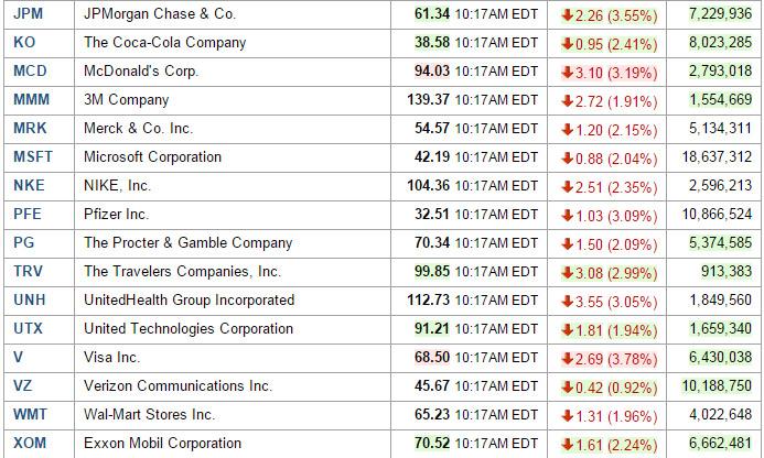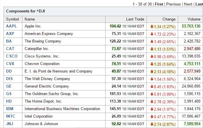 Ο Dow Jones «άνοιξε» με απώλειες 1.089 μονάδων, ενώ αυτή τη στιγμή κινείται κατά 710 μονάδες χαμηλότερα ή 4,3% στις 15.749 μονάδες. Και οι 30 μετοχές του δείκτη των blue chips καταγράφουν ισχυρή πτώση, με μεγαλύτερα θύματα τους τίτλους εταιρειών με σημαντική εξάρτηση από την Κίνα, όπως αυτοί των Apple (-3,8%) και Cisco (-5%).