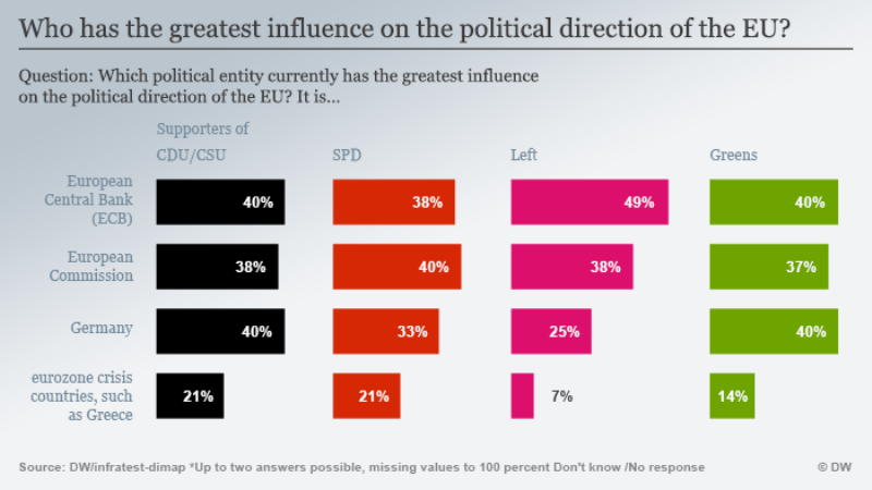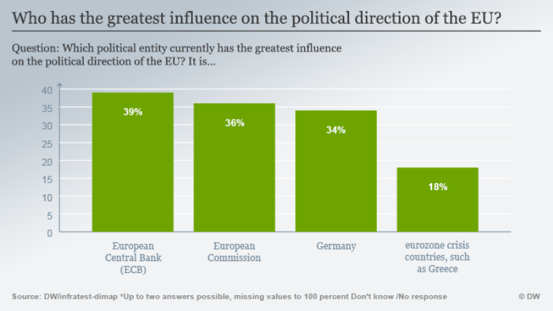 Η απάντηση λοιπόν δεν είναι ξεκάθαρη και καθρεφτίζει σύμφωνα με το ινστιτούτο δημοσκοπήσεων “infratest-dimap” την τωρινή πολιτική κατάσταση στην Ευρώπη και την ισχυρή παρουσία των θεσμών της Ευρωπαϊκής Ένωσης στις αναφορές των ΜΜΕ. Οι χώρες που επηρεάστηκαν έντονα από την κρίση στην ευρωζώνη, όπως η Ελλάδα, θεωρούνται από τους συμμετέχοντες στην έρευνα ότι δεν ασκούν μεγάλη επιρροή, λαμβάνοντας ποσοστό 18% στη δημοσκόπηση.
