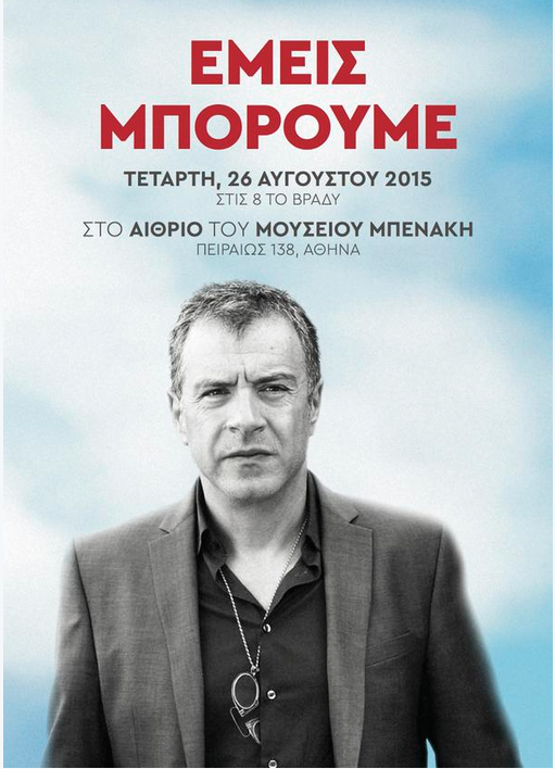 «Εμείς μπορούμε» είναι το σύνθημα της εναρκτήριας προεκλογικής ομιλίας του Σταύρου Θεοδωράκη προς τους υποστηρικτές του Ποταμιού από όλη την Ελλάδα που καλούνται την Τετάρτη στις 8 το βράδυ στο Αίθριο του Μουσείου Μπενάκη, Πειραιώς 138.