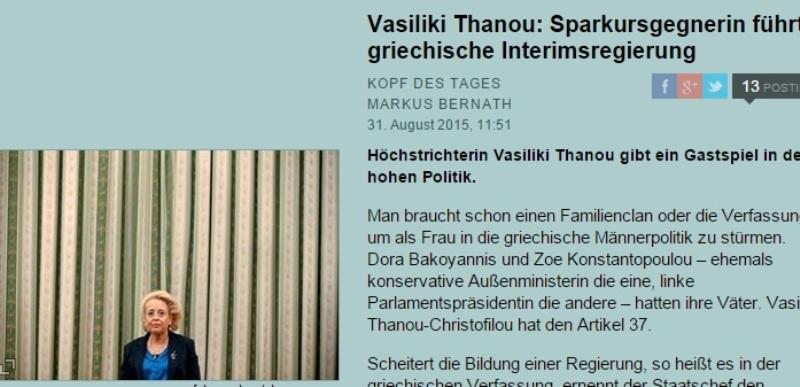 «Να επικρατήσει κανείς ως γυναίκα στην ανδροκρατούμενη πολιτική της Ελλάδας χρειάζεται μια οικογενειακή δυναστεία ή το Σύνταγμα -η συντηρητική πρώην υπουργός Εξωτερικών Ντόρα Μπακογιάννη και η αριστερή πρόεδρος της Βουλής Ζωή Κωνσταντοπούλου είχαν τους πατέρες τους, η Βασιλική Θάνου-Χριστοφίλου έχει το άρθρο 37 του Συντάγματος-», σημειώνεται εισαγωγικά στο “πορτρέτο” της επικεφαλής της υπηρεσιακής κυβέρνησης, που παρουσιάζει στο φύλλο της Δευτέρας η αυστριακή εφημερίδα «Der Standand», με τίτλο «Αντίπαλος της πολιτικής λιτότητας ηγείται της ελληνικής υπηρεσιακής κυβέρνησης».