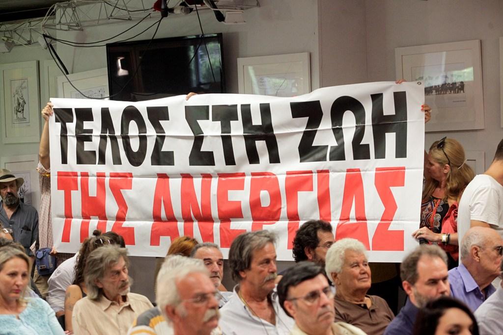 Την ώρα που η πρόεδρος της Βουλής Ζωή Κωνσταντοπούλου εξηγούσε τα μελλοντικά της σχέδια στα γραφεία της ΕΣΗΕΑ, συμβασιούχοι του Κοινοβουλίου αλλά και υπάλληλοι στο κανάλι της Βουλής σήκωσαν το δικό τους πανό το οποίο έγραφε: «ΤΕΛΟΣ ΣΤΗ ΖΩΗ ΤΗΣ ΑΝΕΡΓΙΑΣ».