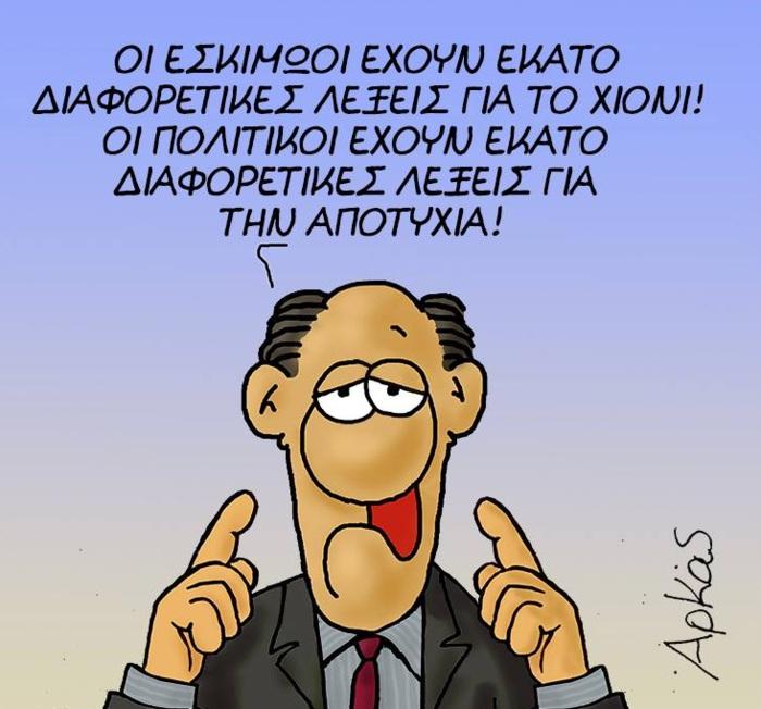 Τους πολιτικούς θέλησε να σατιρίσει ο γνωστός σκιτσογράφος Αρκάς σε νέο σκίτσο του, στο οποίο τους συγκρίνει με τους Εσκιμώους στην χρήση των λέξεων.
