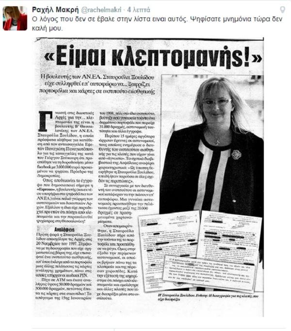 Η υποψήφια βουλευτής της Λαϊκής Ενότητας στο λογαριασμό της στο Twitter γράφει:” Ο λόγος που δεν σε έβαλε στην λίστα ειναι αυτός. Ψηφίσατε μνημόνια τώρα δεν καλή μου” και αναρτά ένα δημοσίευμα στο οποίο αναφέρεται πως η Σταυρούλα Ξουλίδου είναι κλεπτομανής και είχε συλληφθεί να αφαιρεί πορτοφόλια και κάρτες σε ινστιτούτο αισθητικής.
