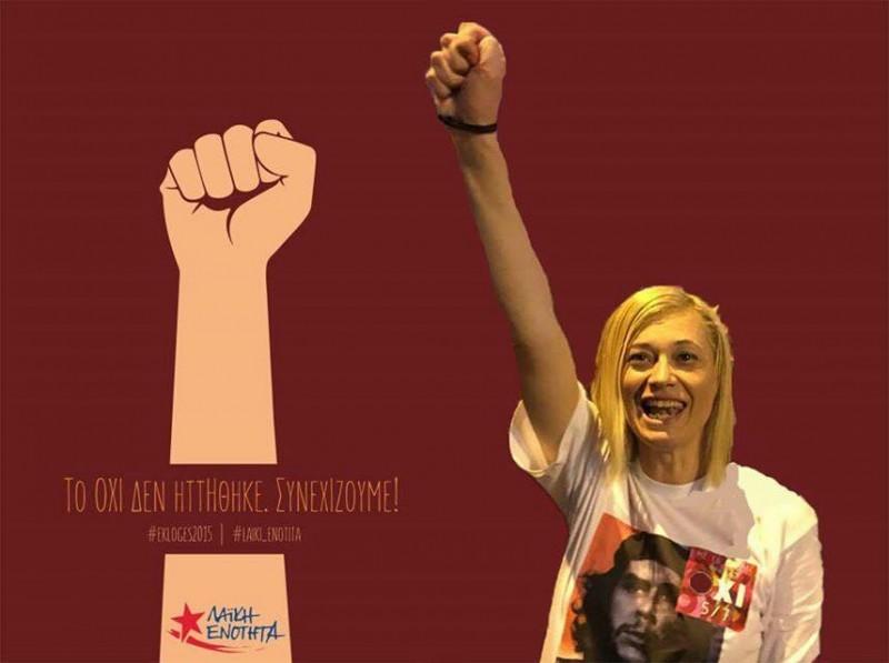 Η υποψήφια βουλευτής αν και βρίσκεται σε μη εκλόγιμη θέση στο ψηφοδέλτιο της περιφέρειας Αττικής «ξεκαθαρίζει» πως είναι «εδώ» το ίδιο δυναμική και σταθερή στο «Όχι» το οποίο και βροντοφωνάζει και μέσω της «επαναστατικής» αφίσας της, στην οποία «πρωταγωνιστεί» η μπλούζα με τον Τσε Γκεβάρα που φορούσε και στις διαδηλώσεις υπέρ του «ΟΧΙ» στην πλατεία Συντάγματος, αλλά και η υψωμένη γροθιά της.