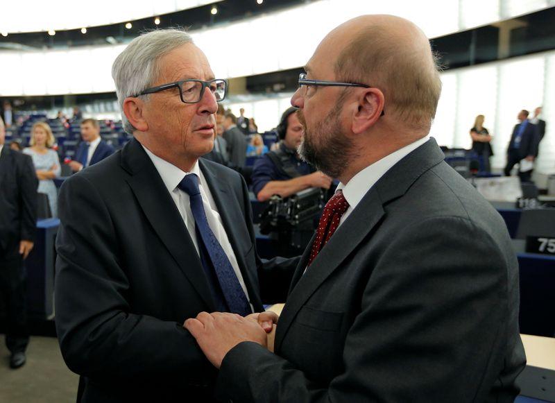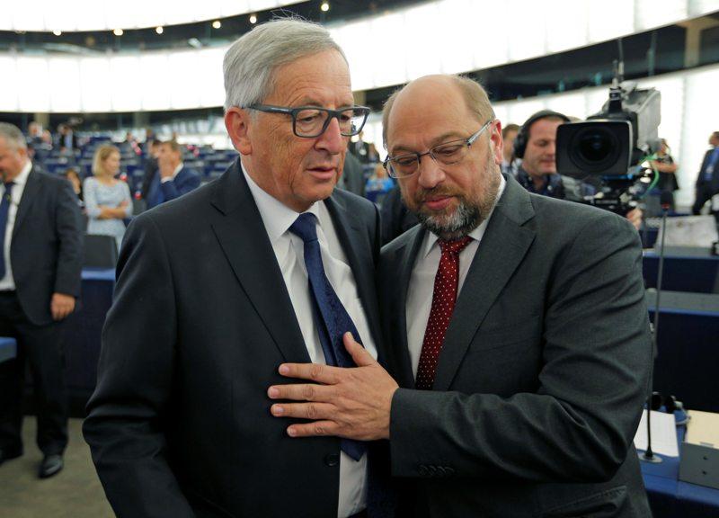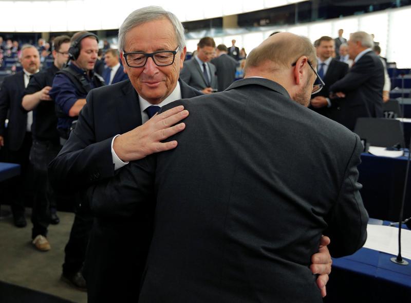 Στιγμές αβρότητας στο Ευρωπαϊκό Κοινοβούλιο, ανάμεσα στον πρόεδρο της Κομισιόν, Ζαν Κλοντ Γιούνκερ και τον πρόεδρο του Ευρωπαϊκού Κοινοβουλίου, Μάρτιν Σουλτς.
